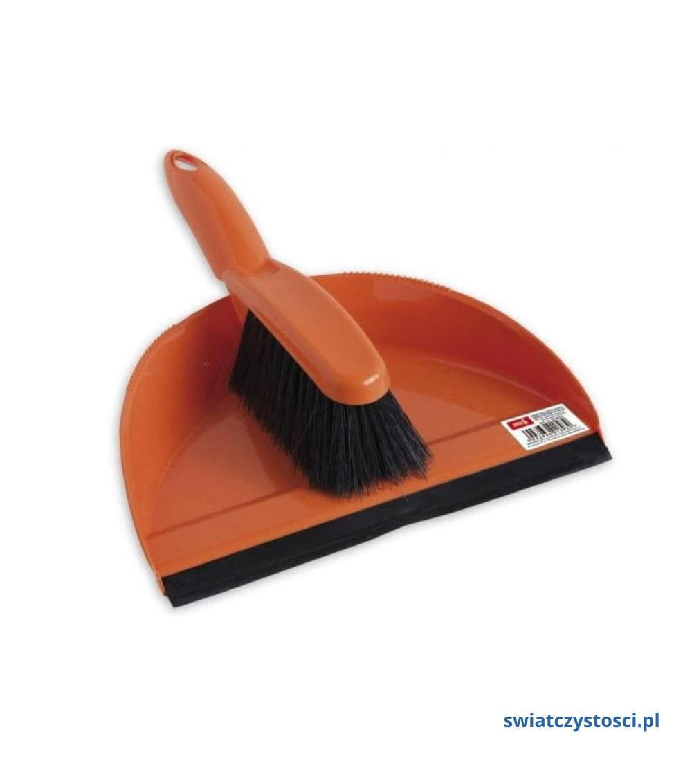 Tradycyjna zmiotka i szufelka do użytku domowego. Zmiotka z syntetycznym włosiem i plastikową oprawą. Posiada rozszczepione na końcach włókna co poprawia skuteczność zbierania śmieci i kurzu. Szufelka zakończona gumą, która zapewnia dokładne przyleganie do czyszczonej powierzchni.