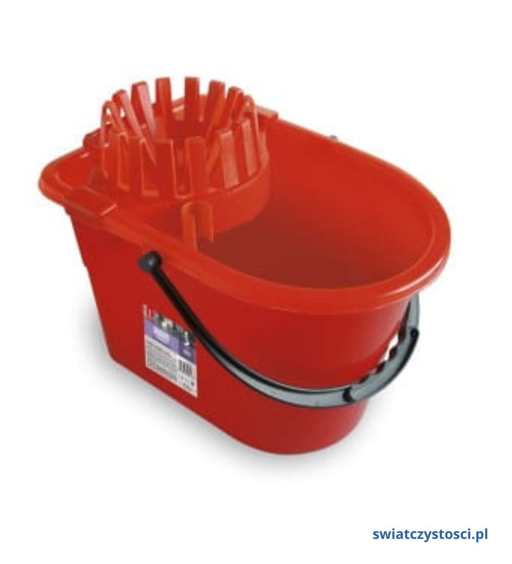 Wiadro 14l z wyciskaczem czerwone idealnie sprawdzi się do mycia i sprzątania na mokro z użyciem mopa. Jest praktyczne, gdyż posiada wbudowany wyciskacz i ma aż 14 litrów pojemności. Czerwone wiadro jest wykonane z grubego i odpornego na zniszczenia plastiku, a plastikowa rączka została dodatkowo wzmocniona przy zaczepach do wiadra, więc jest to produkt wyjątkowo trwały. Prostokątny kształt wiadra i czerwony kolor wpływają na nowoczesny wygląd wiadra.