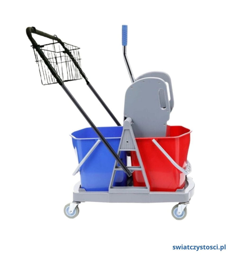 Wózek do sprzątania dwuwiadrowy, dwa wiadra 17 l. prasa do mopów, koszyk metalowy czarny